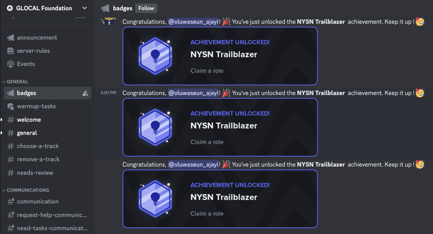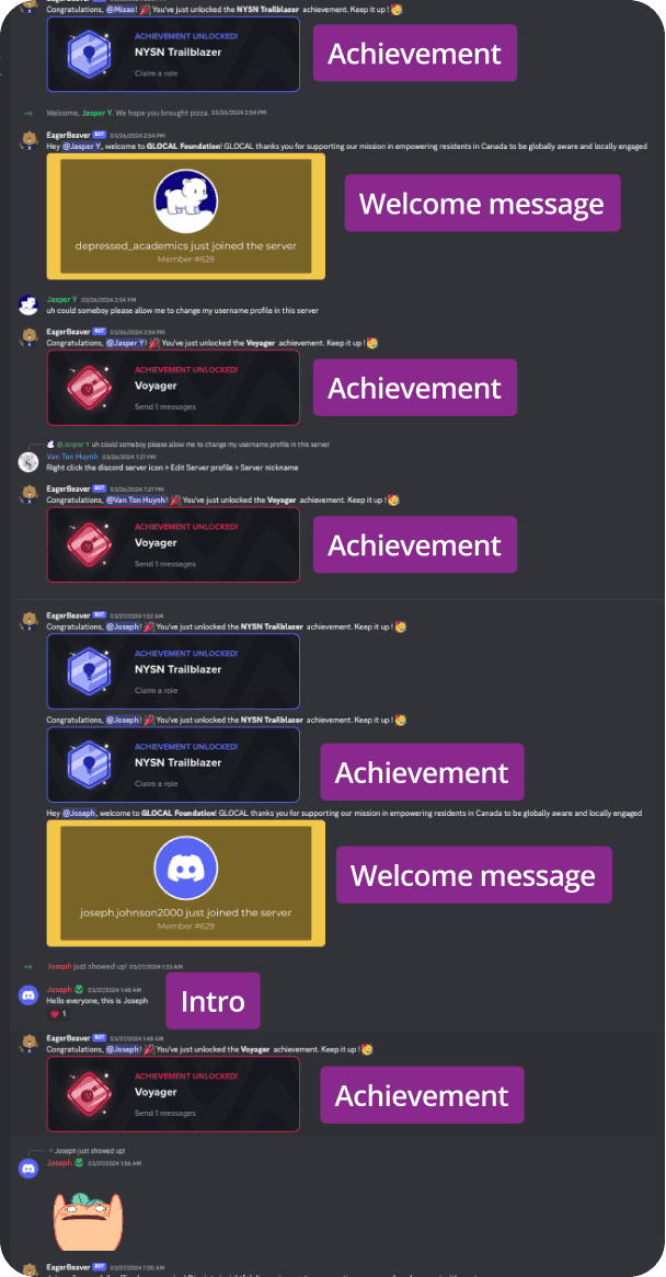 Based on our recommendations, GLOCAL was able to start improving its volunteer user experience by making changes within its constraints and budget. For example, they separated the Discord channels for badges and announcements. Now, volunteers can easily find important announcements without being overwhelmed by the flood of achievement badges.
